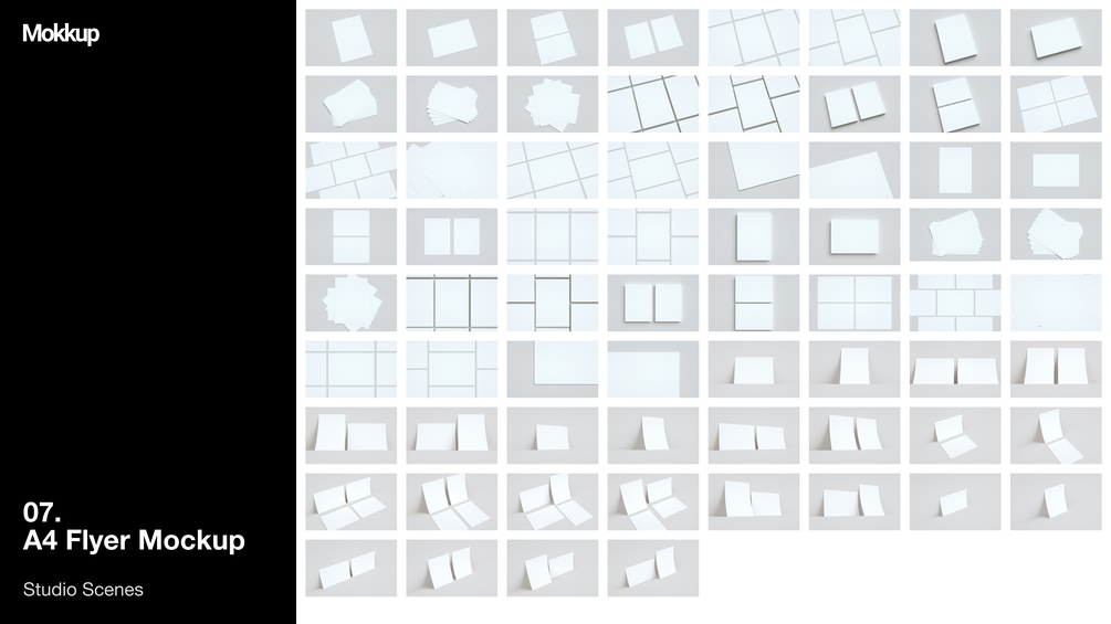 You'll get 68 high-res images of A4 paper size flyer mockups in a studio setting.